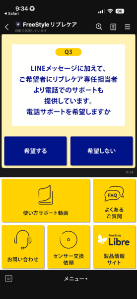 なぜかというと、使い始めてから7日後と14日後(=はじめてセンサーを交換するタイミング!)に、専門のサポート担当者から電話がかかってきて、わからないことを直接相談できるからです。