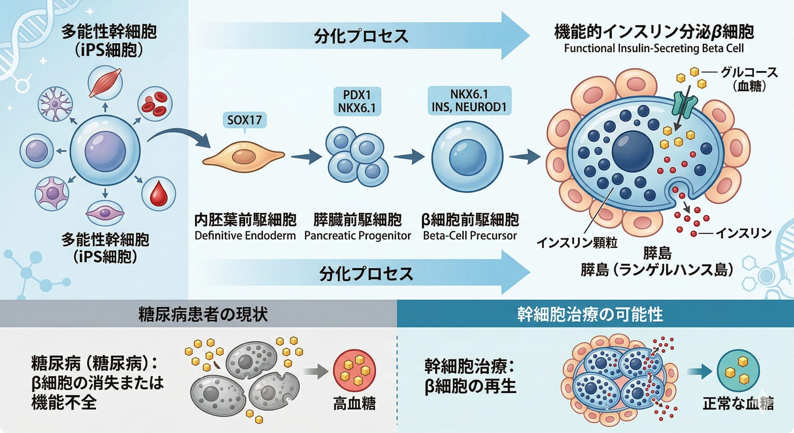特に1型糖尿病ではiPS細胞などを用いた